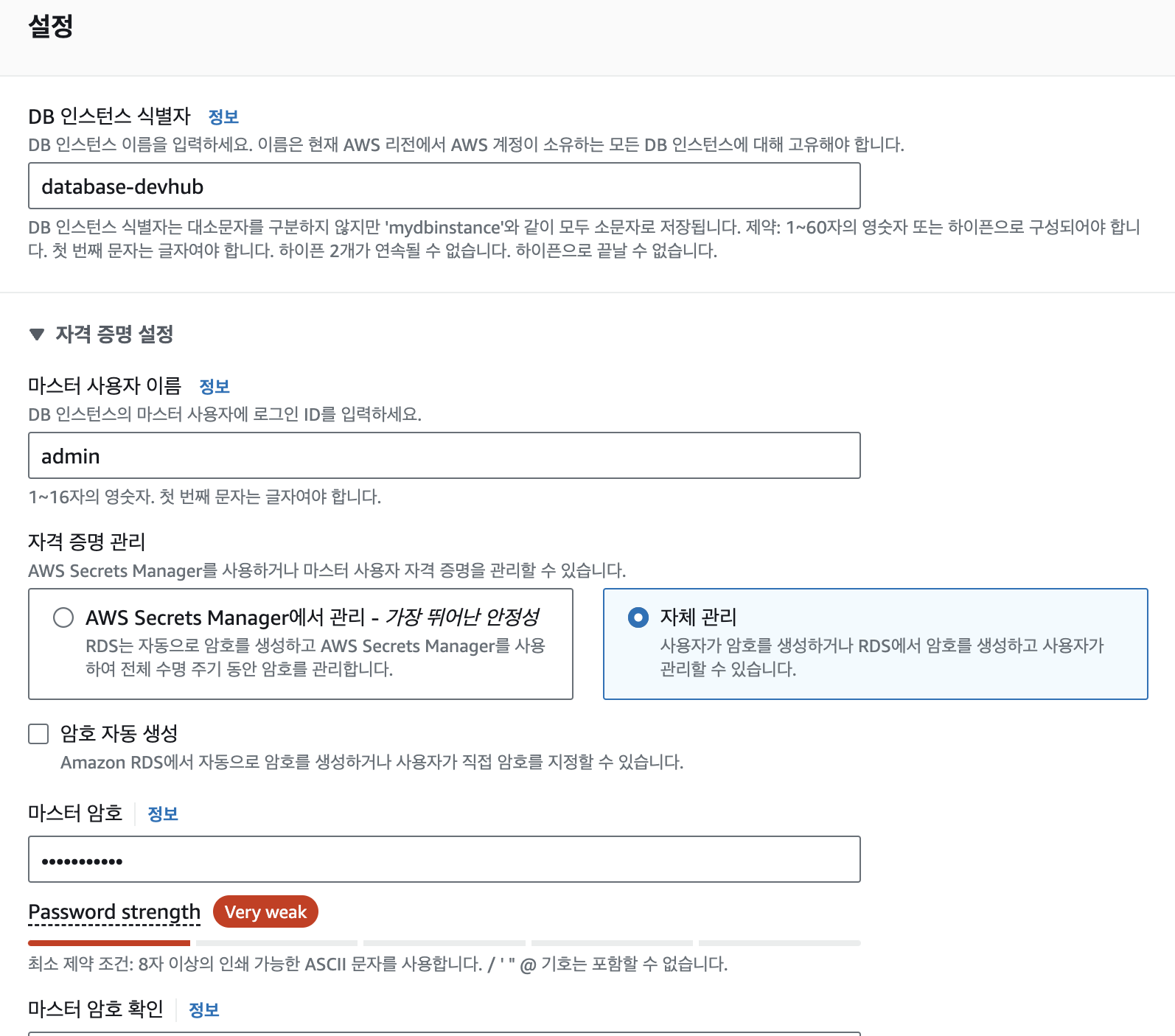 스토리지 자동 조정 옵션은 비활성화 해줍니다. (활성화 시, 요금 부과 발생)